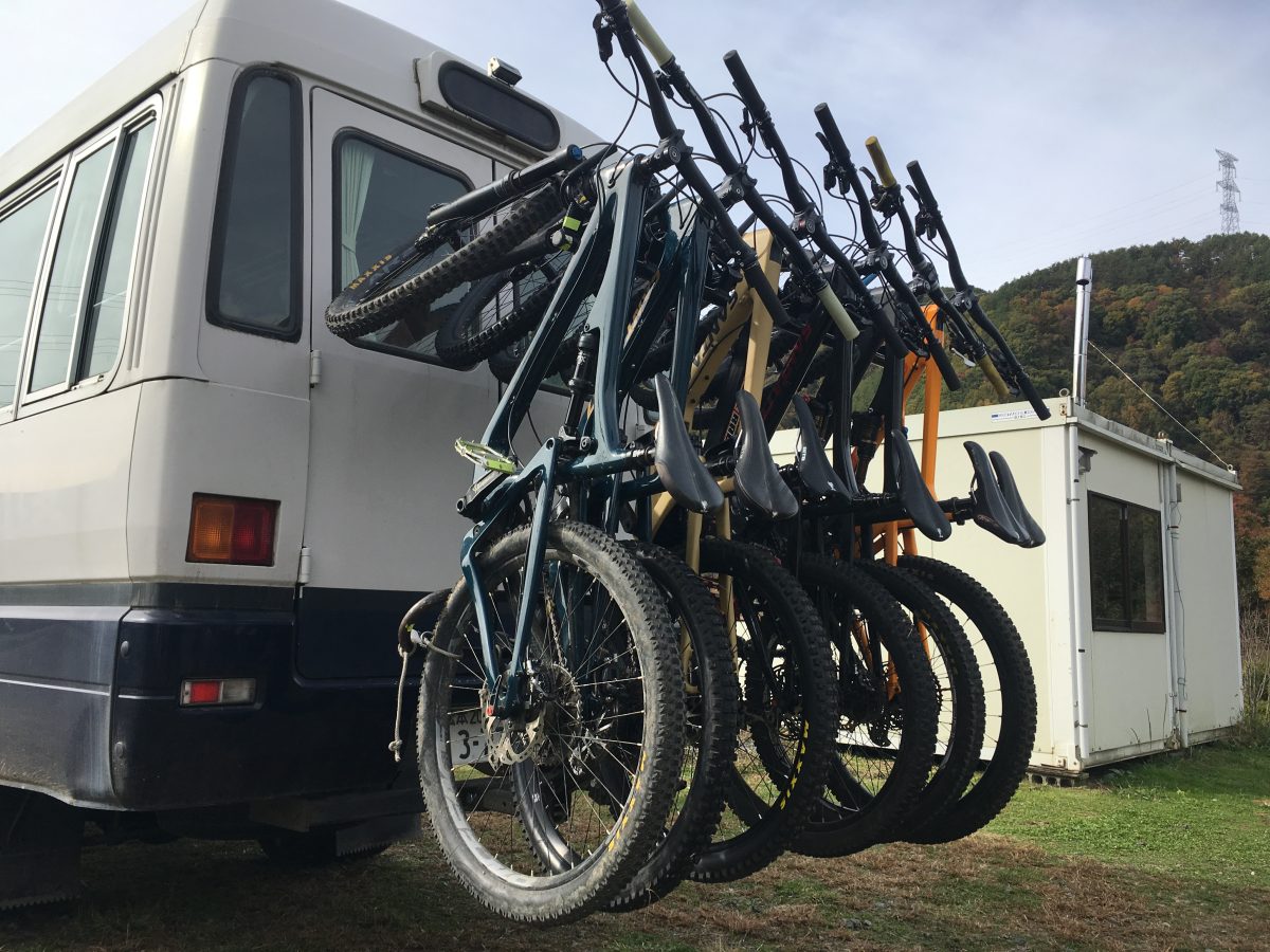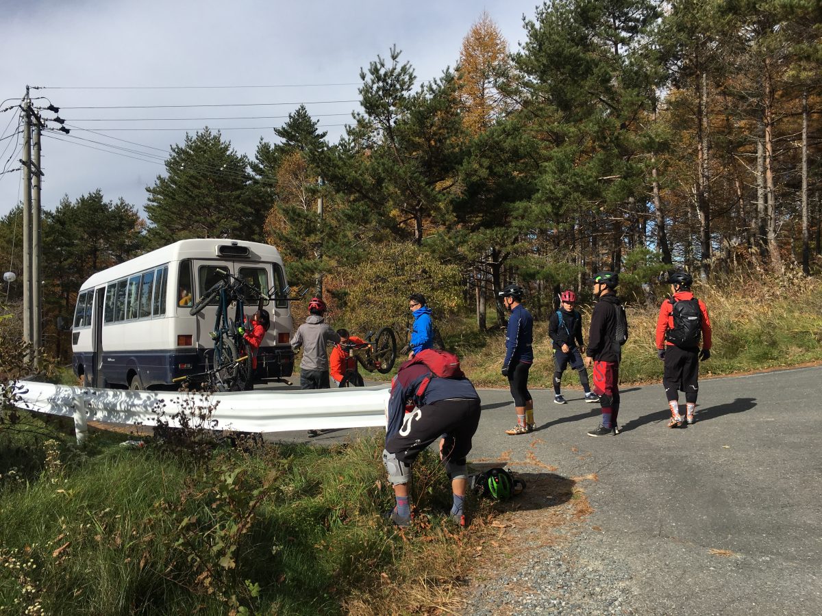 写真のように自転車をバスに載せて山頂まで送っていただきます。